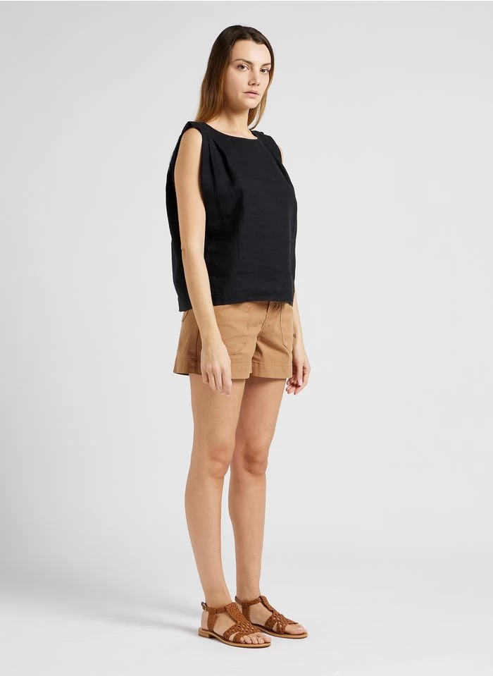 Dit model wordt aangeboden met Wijd short met hoge taille by MKT, Platte, leren sandalen by COULEUR POURPRE